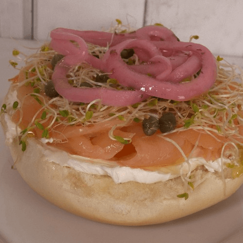Delicious all natural smoked Norwegian Lox on a cream cheese bagel topped with capers and onions