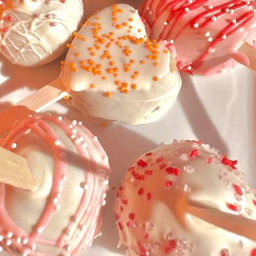 Our house made cake pops are all made from scratch. Vanilla cake and frosting topped with Valentine themed decor.