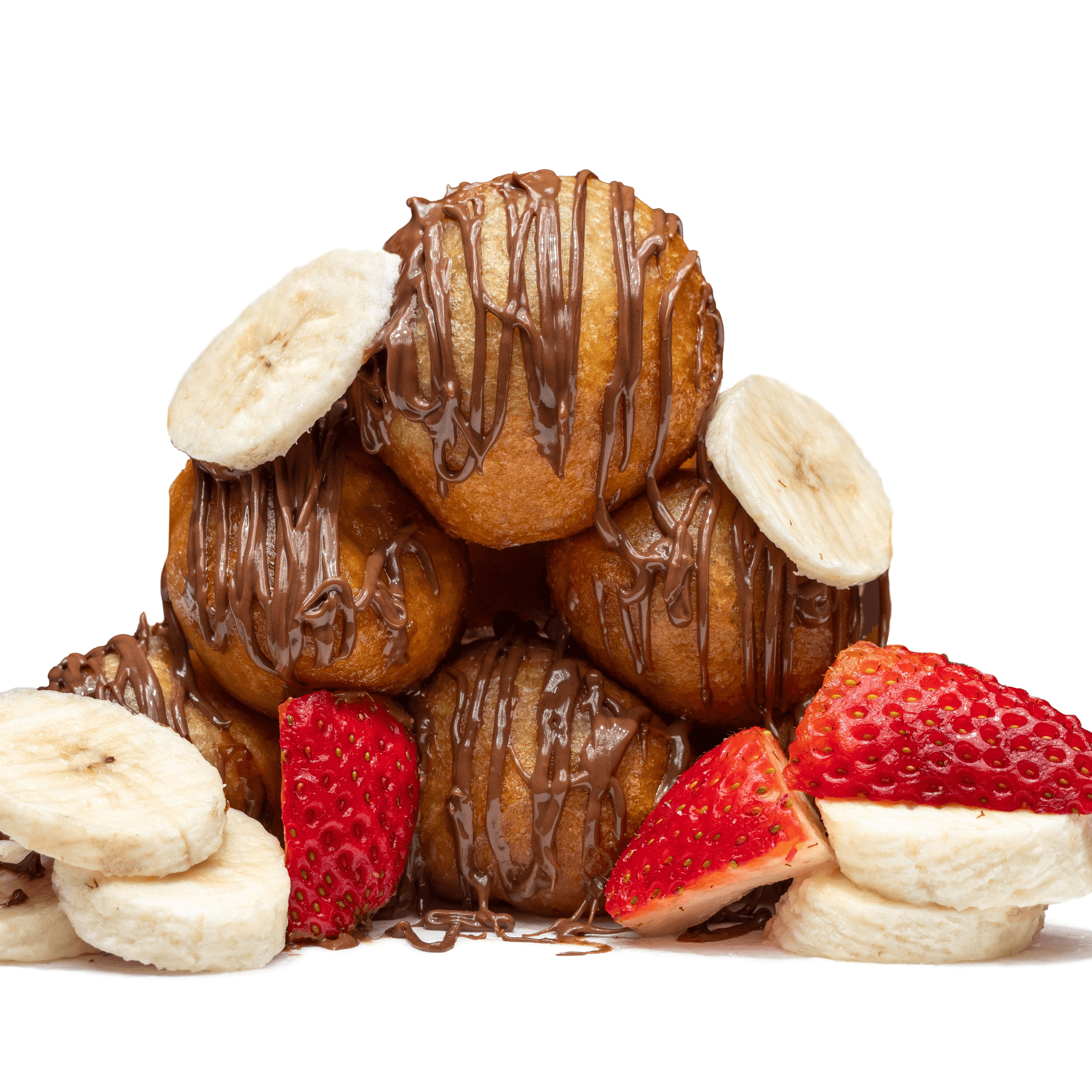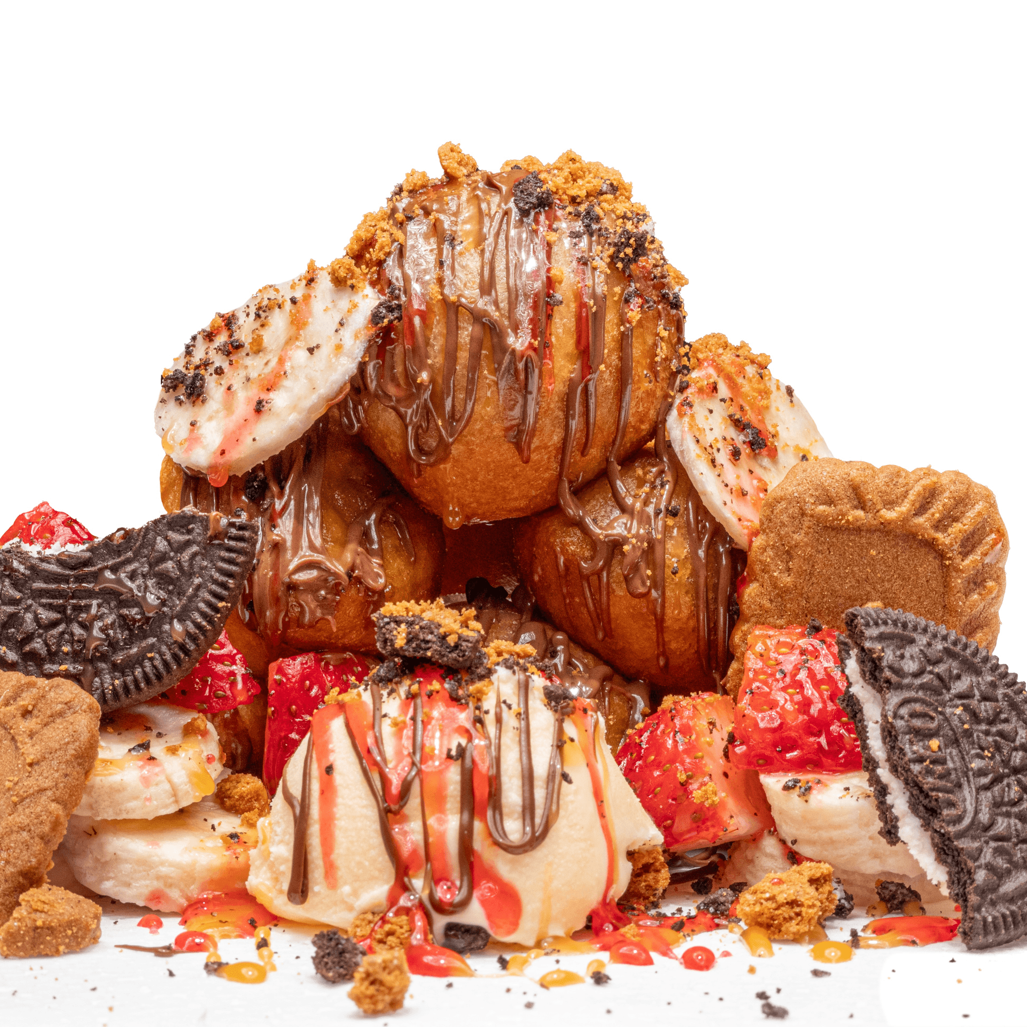 our signature warm ballers topped with nutella drizzle, crushed biscoff, oreo, pecans, bananas and strawberry, and a scoop of vanilla ice cream!!!