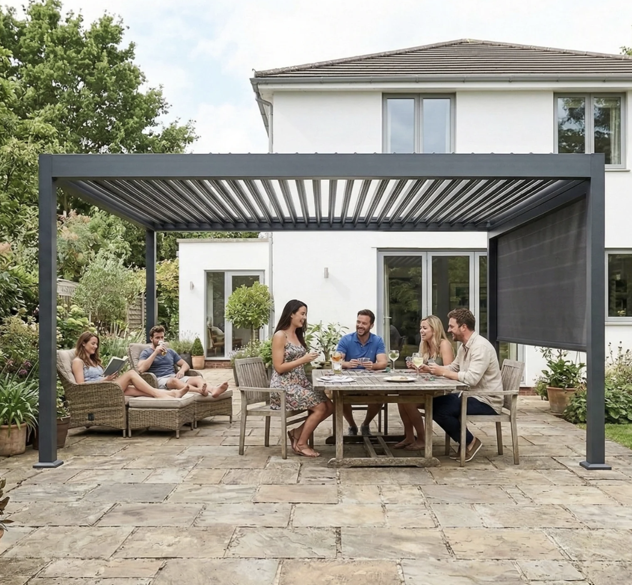 The Sunkisser SK1 is a premium manual louvered pergola built with 6061-T6 aluminum for weatherproof, year-round outdoor living. Backed by a 5-year warranty + 5-year in-person support, this manual hand-crank pergola delivers effortless shade and airflow control without apps or batteries. Adjustable louvers rotate 0–135° for perfect sun management. Powder-coated finish resists UV, rain, and coastal salt air. Available in Anthracite, Black, and White with sizes from 10x6 to 13x13. Optional add-ons include infrared heaters, LED lighting, and privacy blinds. Free shipping. Professional installation available in Los Angeles County.