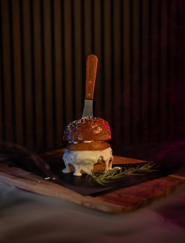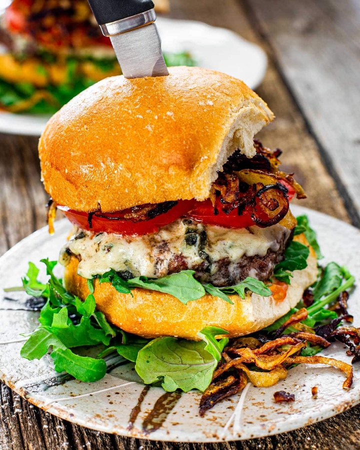 Beef patty, bacon jam, arugula, garlic aioli, blue cheese and crispy onion ring inside a brioche bun.